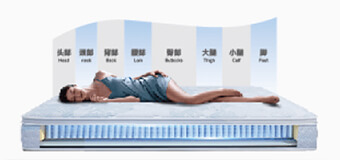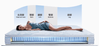 将床垫划分为头颈部、背部、腰部、臀部、腿部五区承托,比三区划分更细致,按照不同部位着力状况分布弹簧,贴合身体曲线,放松肌肉,适合侧睡者;