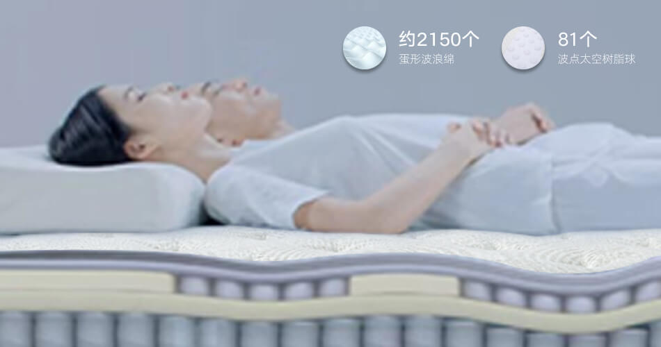 81个波点太空树脂球+约2150个蛋形波浪绵将床垫 舒适层划分成不同舒缓程度的三区五段设计,根据 身体不同部位匹配相应轻微指压按摩触感。