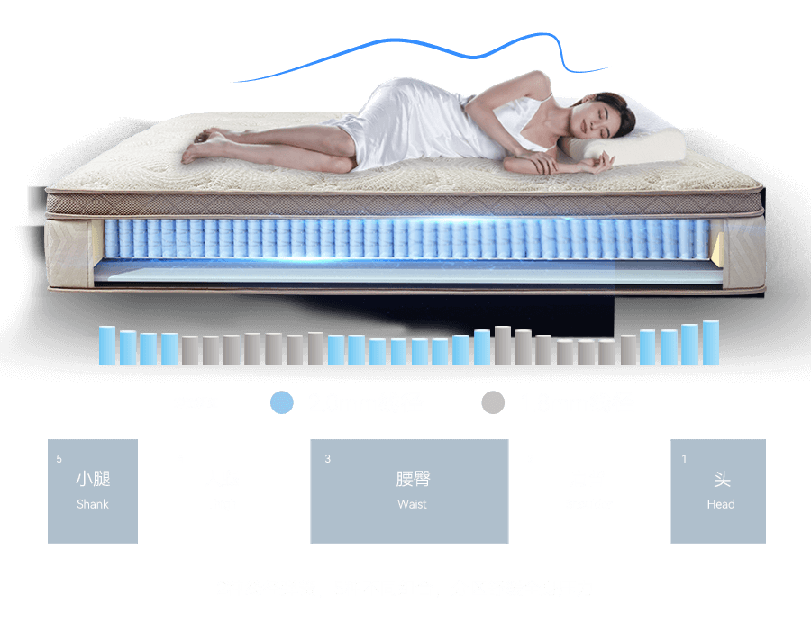 基于400万+中国家庭睡眠数据研究,人体工程学设计,针对人体“头、肩背、腰臀、大腿、小腿”等分区支撑。